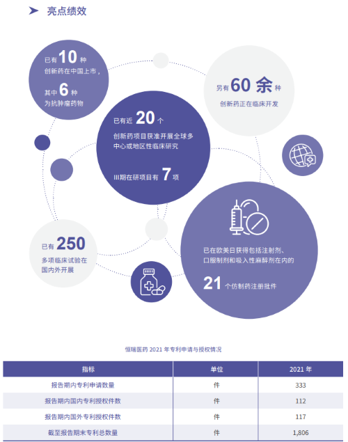 报告指出,在科技创新战略引领下,AG官网医药2021年累计研发投入62.03亿元,比上年增长24.34%,研发投入占销售收入比重达到23.95%,再创历史新高。以此为支撑,2021年公司有3款创新药获批上市,已上市创新药总量增至10款,其中6款为抗肿瘤药物。同时还有60余种创新药正在临床开发,250多项临床试验在国内外开展,其中近20个创新药项目获准开展全球多中心或地区性临床研究。在创新药研发上,AG官网医药已基本形成了上市一批、临床一批、开发一批的良性循环。
